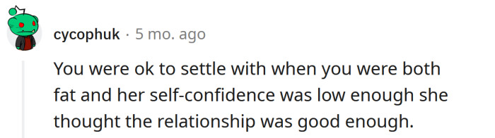 "You were okay to settle with when you were both fat and her self-confidence was low enough."