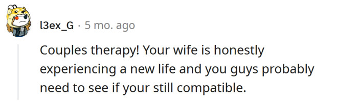 Ultimately, adapting to significant life changes, such as weight loss, requires patience and understanding from both partners. A clinical psychologist might suggest that the couple focus on rebuilding their emotional intimacy through shared experiences and open communication about their evolving identities. By prioritizing their connection and allowing space for vulnerability, they can strengthen their relationship amidst these changes.