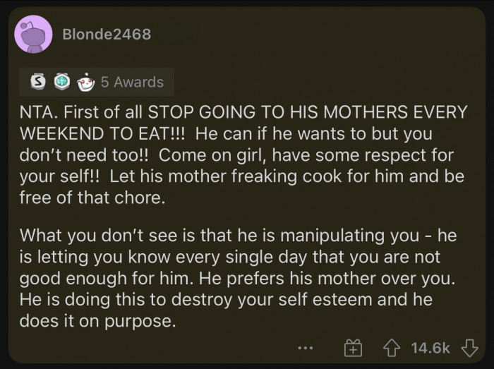 Reddit: r/AmItheA**hole/OP's husband would expect his mom to send him a meal, and his wife grew tired of that.