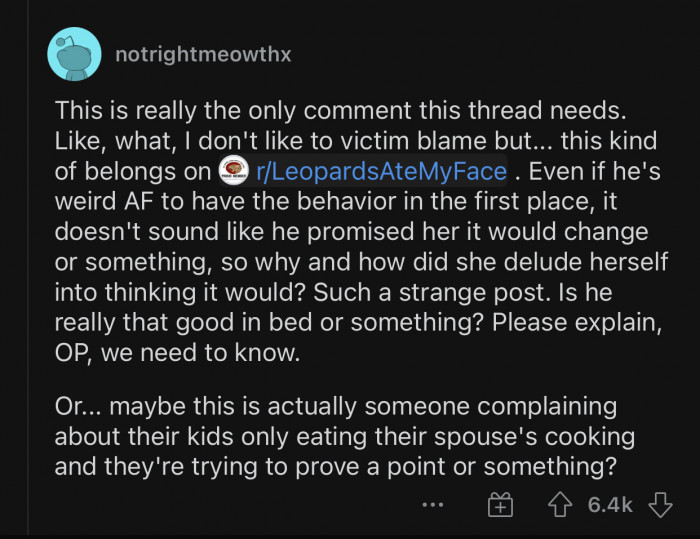 OP's relationship with her husband is quite strange, and the fact that this is still an issue after they have already gotten married makes it even weirder. The husband admitted that OP's cooking is "exactly what he needed after a long day," and that says it all.