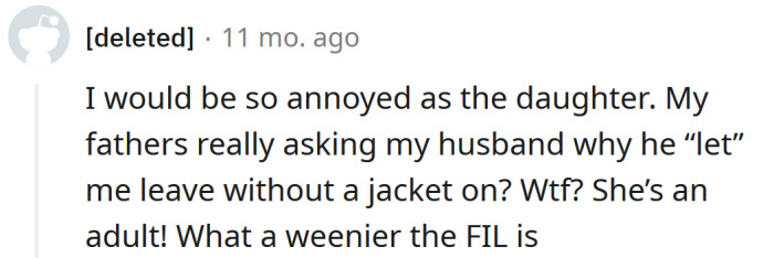 When the OP's wife walked in the door wearing only a t-shirt, she looked flushed, and her fingers had turned pink from the cold. Immediately, her father asked the OP why he "let her leave without a jacket on."