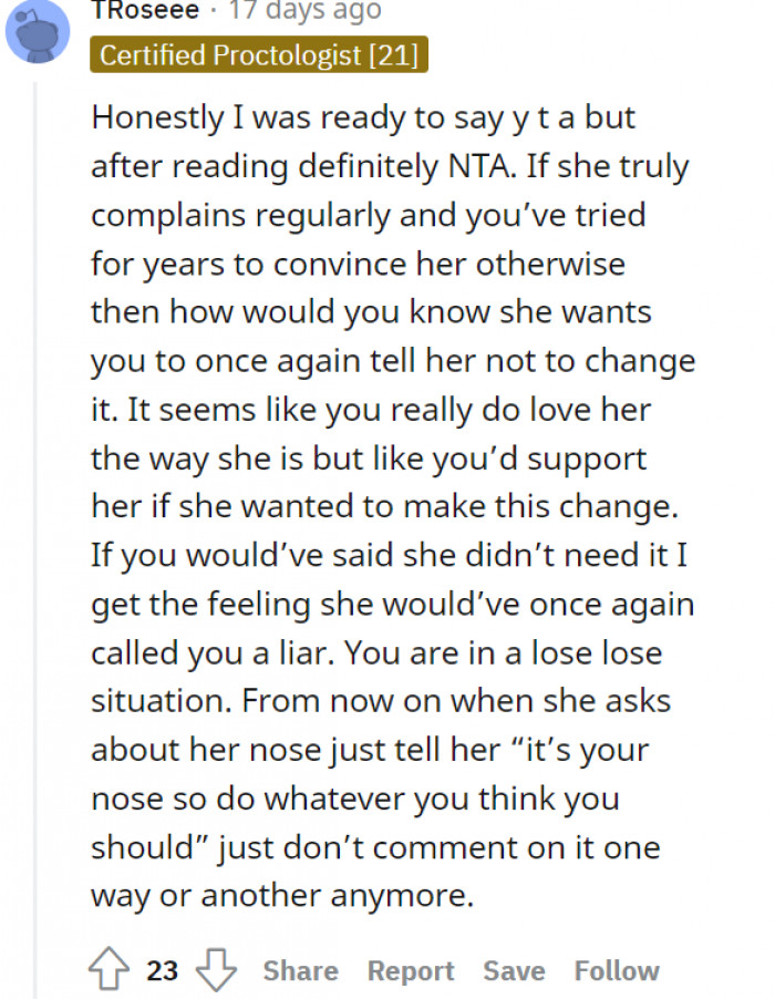 At the end of the day, what matters is that OP should also not fail to make his wife feel loved and enough either way—nose job or none.