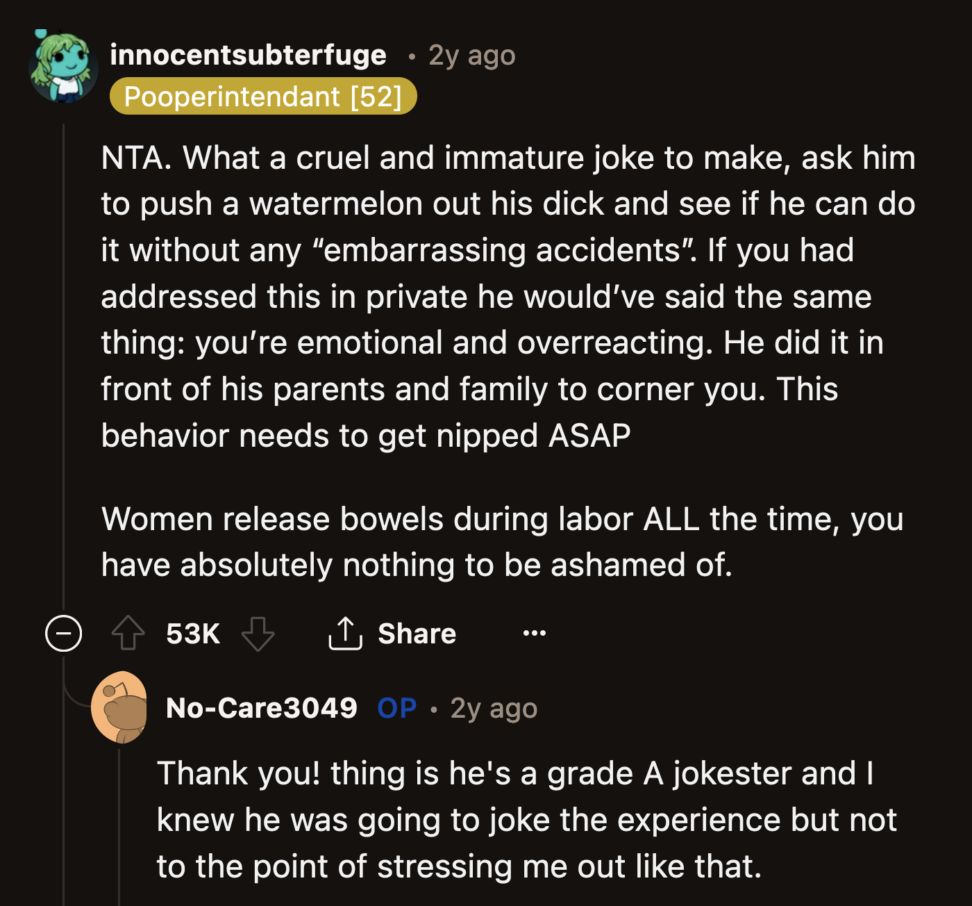 "Ask him to push a watermelon out of his dick and see if he can do it without any 'embarrassing accidents.'"