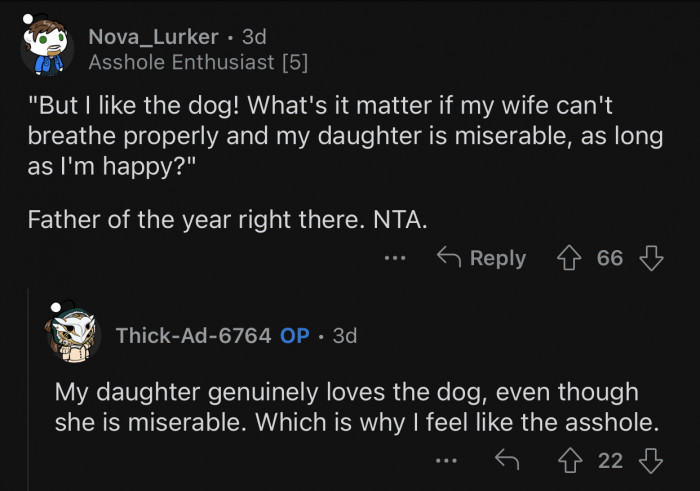 Reddit: r/AmItheA**holeOP and her daughter are allergic to pet dander.