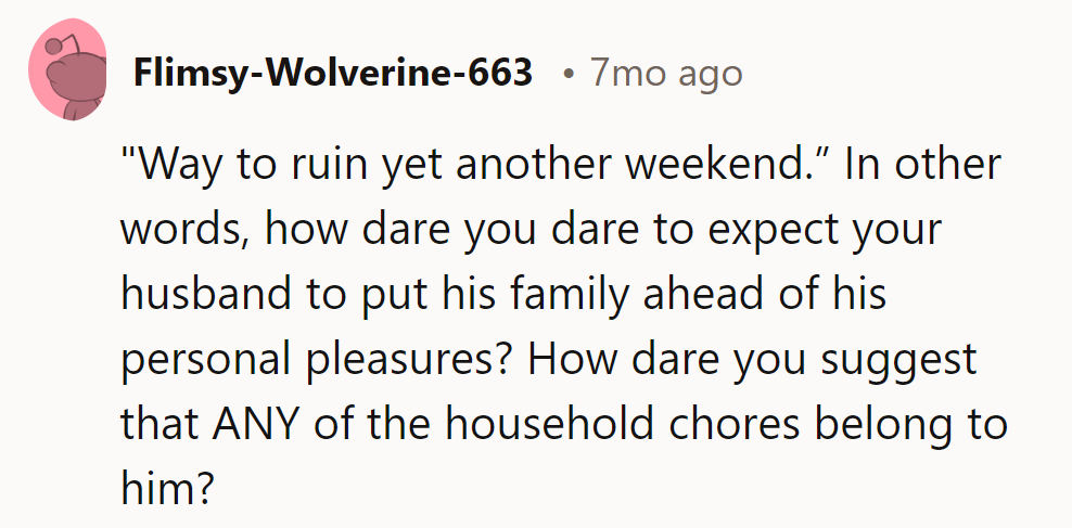 "Way to ruin another weekend." Translation: "Expecting him to prioritize family over fun? Apparently too much!"