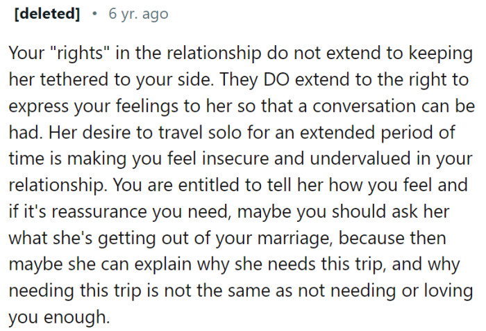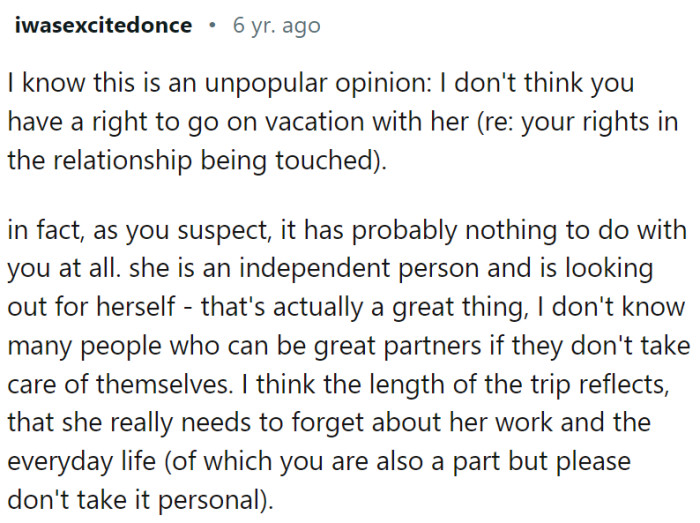 RedditThough OP is supportive of her need to rejuvenate, he's troubled by the length of the trip and her casual attitude toward being apart.