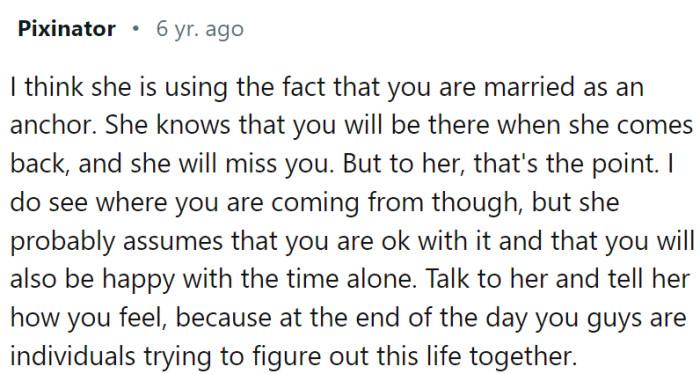 They've gone on trips like this themselves, not because they're unhappy with their partner or want to cheat, but because they just need some time to themselves. Relationships are tricky. Loving someone doesn't mean you stop needing time on your own.