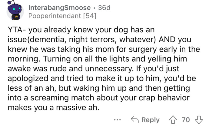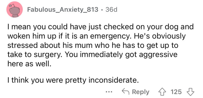The Redditor's husband said he hoped she would apologize for her behavior in the morning, but that only made the OP even angrier, and she continued to argue. The OP's husband needed to wake up early the following morning to take his mother to the hospital for surgery.