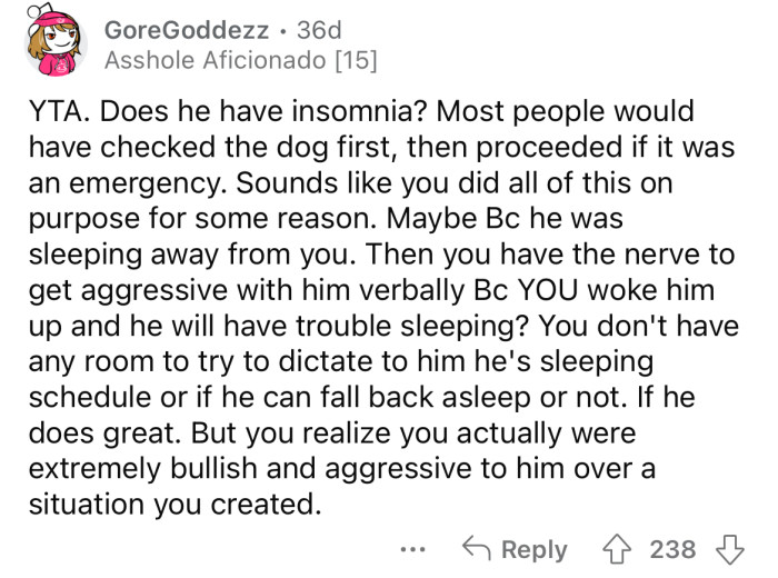 He said he would "pull an all-nighter" because he wouldn't be able to go back to sleep now. The OP says this made her angry, and she aggressively responded, "I don't understand why you cannot go back to sleep."