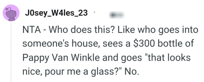I know I may come across as hoity-toity and if this earns an AH judgement, so be it. You wouldn't open a cellared 25 year Bordeaux when you need cooking wine. You wouldnt toss the keys to a Ferrari to a 16 year old with a fresh driving permit. Same with opening barrel aged spirit for those who dont appreciate it and outright abuse it by mixing with soda. There are some finer things in life that come with a lofty price tag and dont deserve to be squandered frivolously. Or else why even spend this kind of money and collect them in the first place?We've gathered some of the most upvoted comments from other Redditors for you to read through below