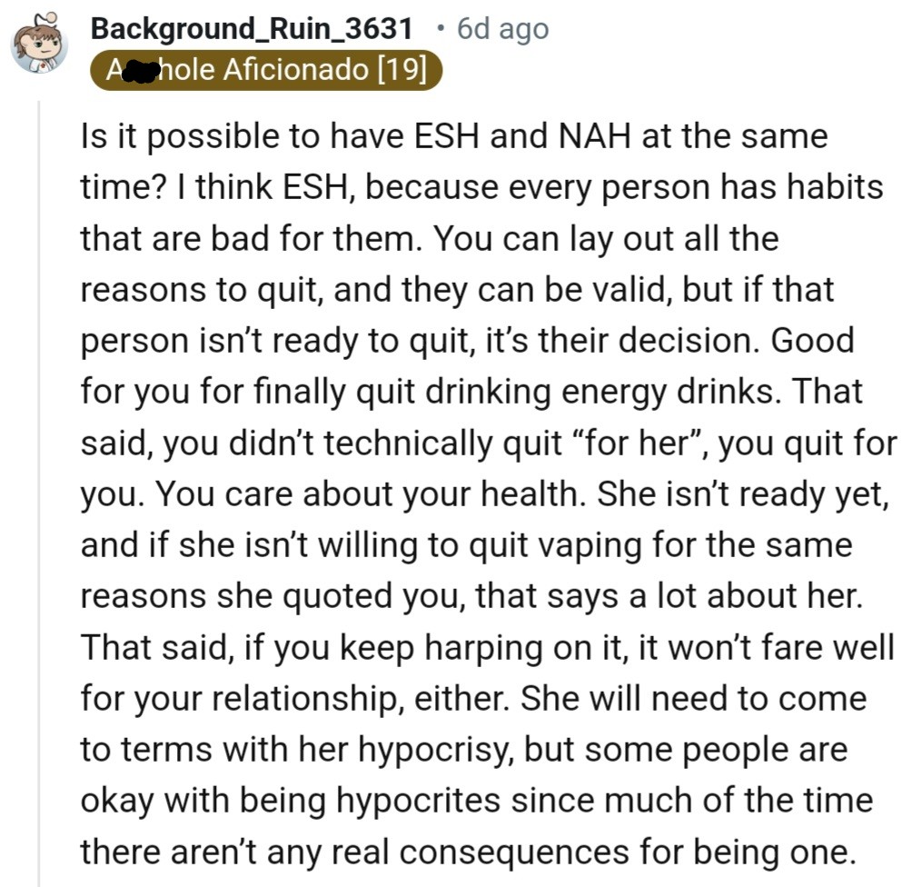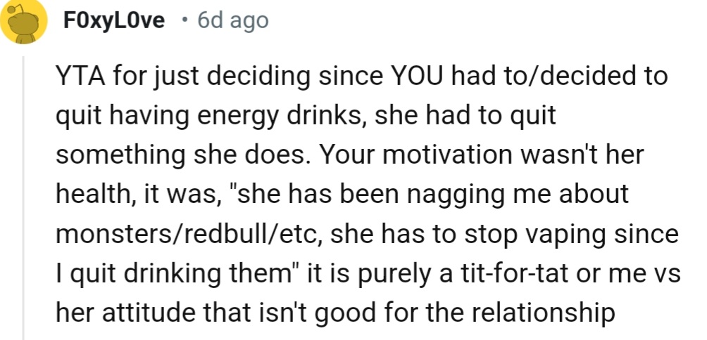 Redditors started off by pointing out how a nicotine addiction is much tougher to kick than an energy drink habit. If OP was genuinely concerned about her health, they advised that he approach it with empathy.