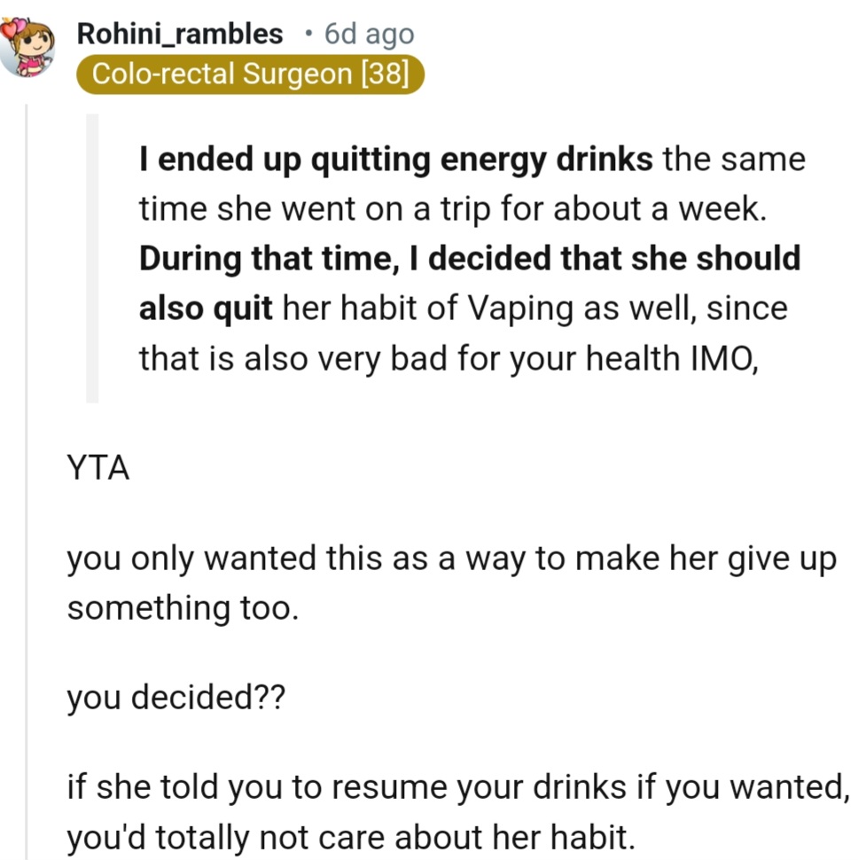 With a reluctant farewell to his daily can of caffeine, he embarked on a two-week journey of abstinence. Then, while his wife was off on a week-long trip, OP had an epiphany: If he could quit his beloved energy drinks, surely his wife could drop her vaping habit.