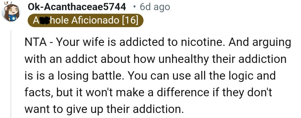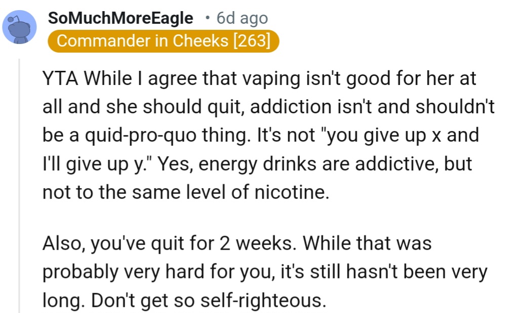 So, when she returned, OP casually suggested that she quit vaping, using the same health-based arguments she had thrown at him. But the conversation quickly took a familiar turn—right into a dead end.