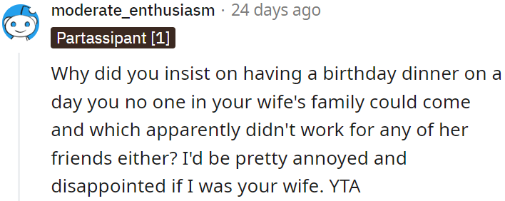 "Why did you insist on having a birthday dinner on a day no one in your wife's family could come?"