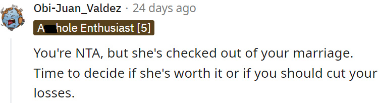 Redditors assured OP that his feelings were all too normal in what they now called a ‘bizarre’ situation. They advised the husband to have a heart-to-heart with his wife, probing why his efforts fell short of her expectations.