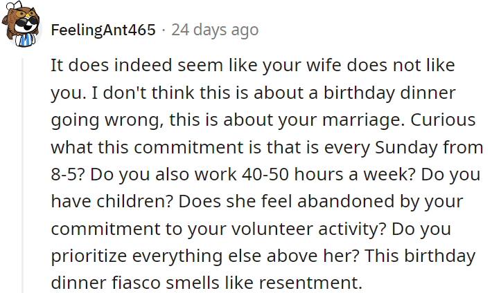 "It does indeed seem like your wife does not like you. I don't think this is about a birthday dinner going wrong."