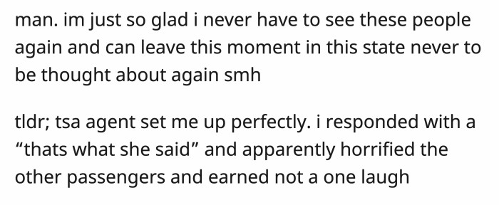 OP didn't have her people who would have totally appreciated her jokes, but she needed an outlet when that TSA agent yelled the perfect setup.