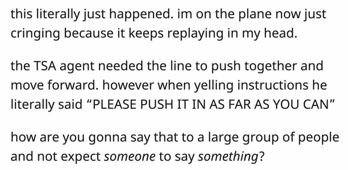 The TSA agent at this young woman's airport needed the line to be pushed together in order to move forward. His yelled instructions were, and I quote, "PLEASE PUSH IT IN AS FAR AS YOU CAN!"