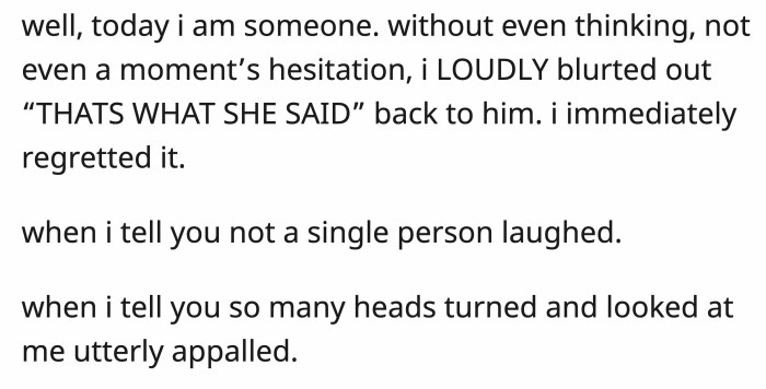 Cue OP, who didn't even think when she immediately yelled back, "THAT'S WHAT SHE SAID!" Her regret came as quickly as her witty retort.