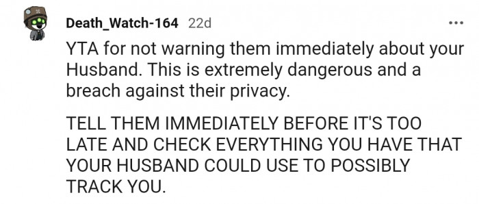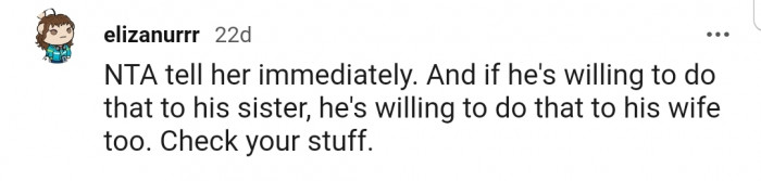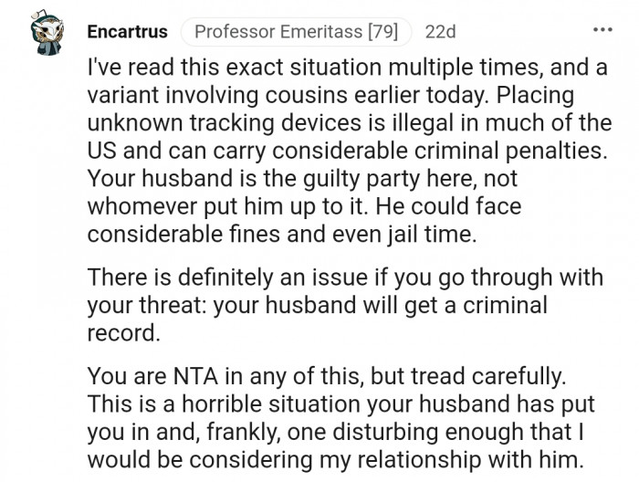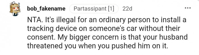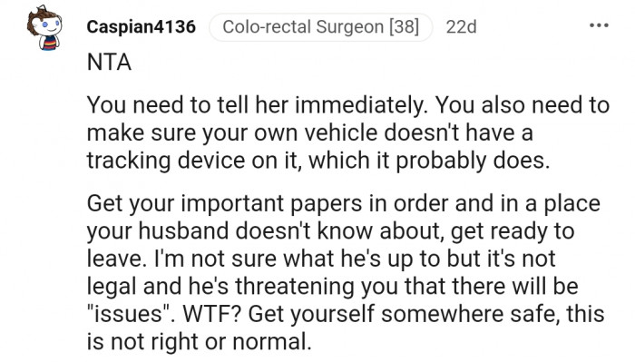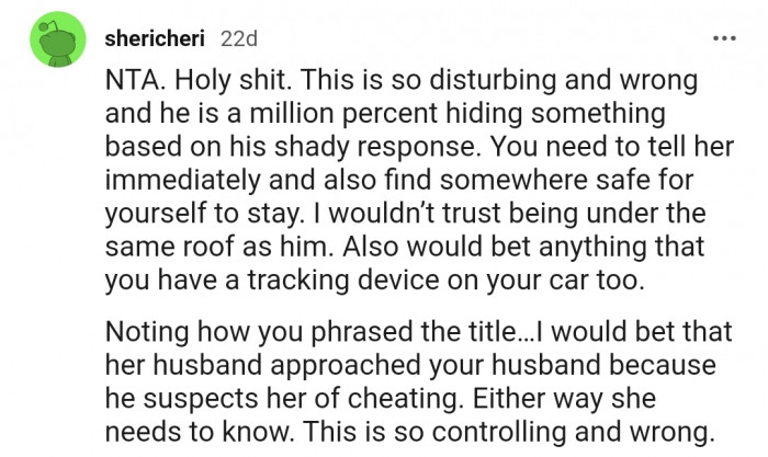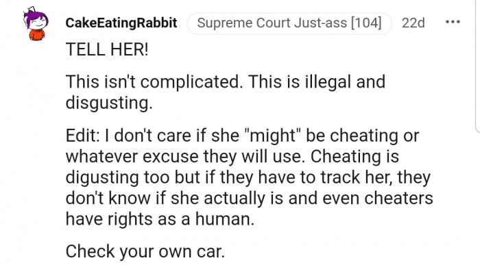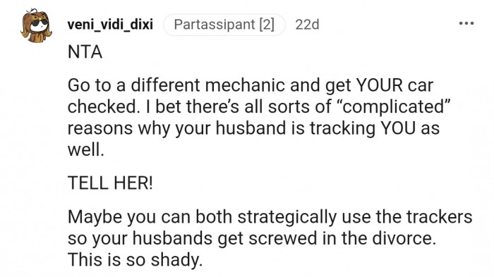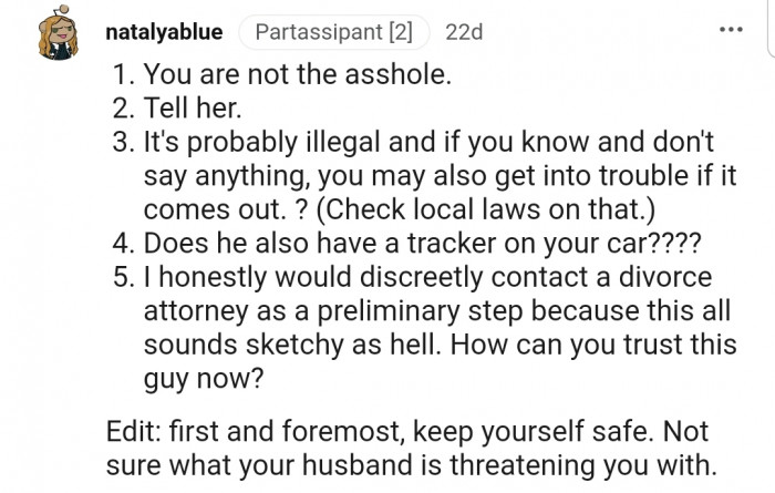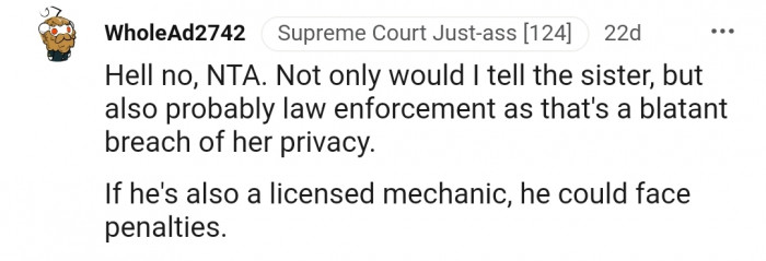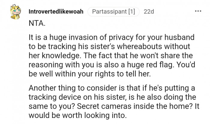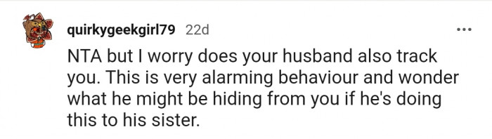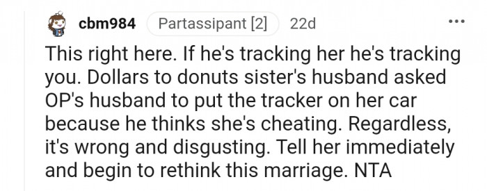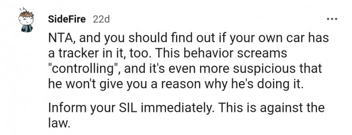 According to the commenters, OP’s husband is invading his sister’s privacy, which is worrisome. Some even advised her to check if he had installed a tracking device in her car as well.