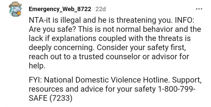 "First and foremost, keep yourself safe. I'm not sure what your husband is threatening you with."