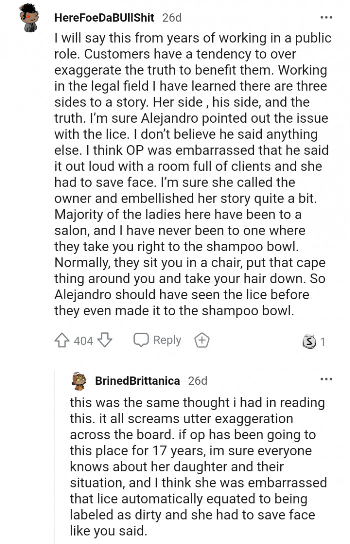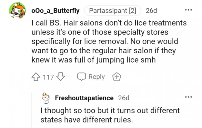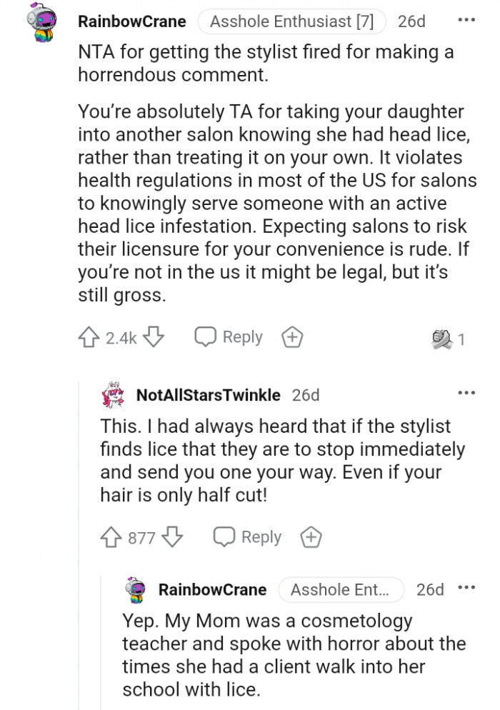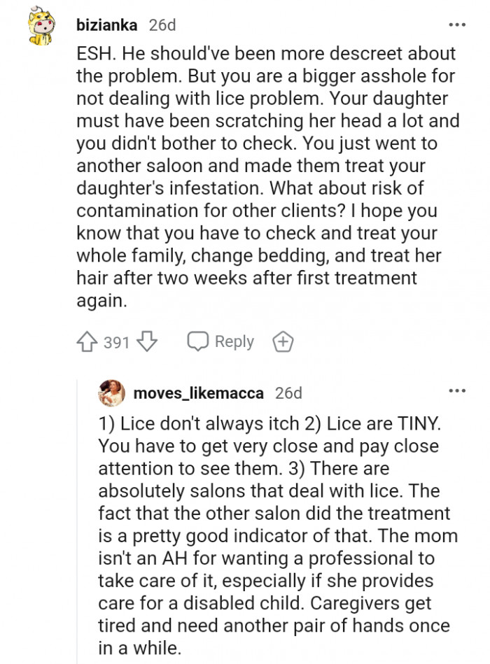 Cautious-Damage7575 / reddit.comOP explained that she took her daughter to their regular saloon for a haircut. In the process, the stylist noticed lice on her hair and created a scene