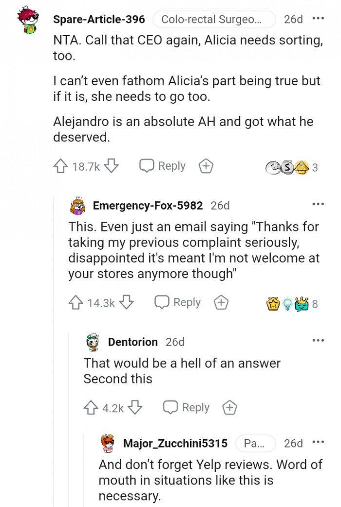 Judging from the comments, we can tell that not many people found Alejandro's behavior appealing. Some people also feel the same about Alicia and even OP for bypassing the manager to report to the CEO.