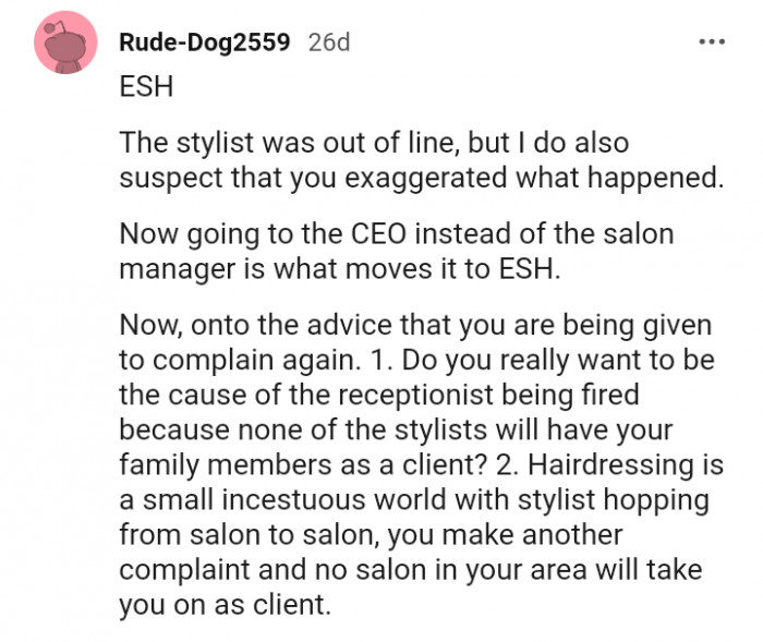 "The stylist was out of line, but I do also suspect that you exaggerated what happened"