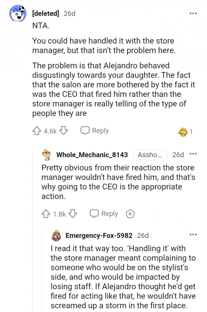 A month later, OP tried to get an appointment for her son but insisted on anyone but the stylist who embarrassed her daughter (Alejandro). The problem was, OP couldn't even get an appointment, and the tone of the stylist who answered the phone was off