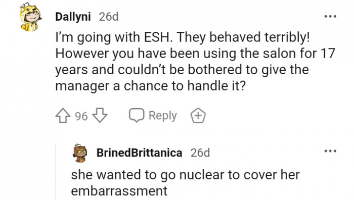"They behaved terribly! However you have been using the salon for 17 years and couldn’t be bothered to give the manager a chance to handle it?"