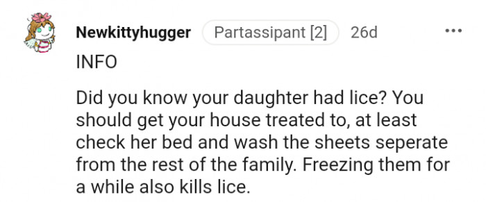 "You should get your house treated to, at least check her bed and wash the sheets separate from the rest of the family"