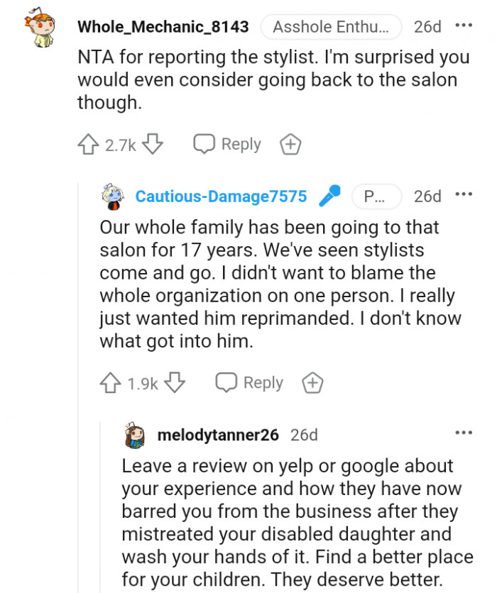 Cautious-Damage7575 / reddit.comUnfortunately, the stylist's reaction caused the poor girl to feel horrible and start crying