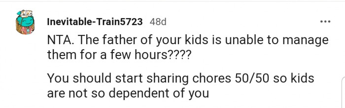 "You should start sharing chores 50/50 so kids are not so dependent on you."