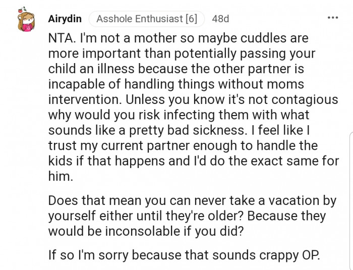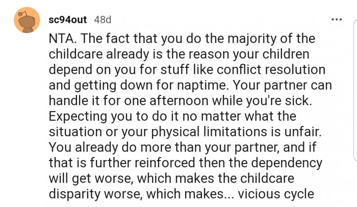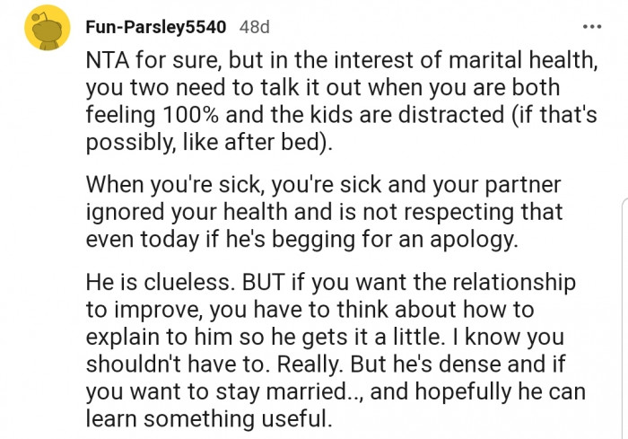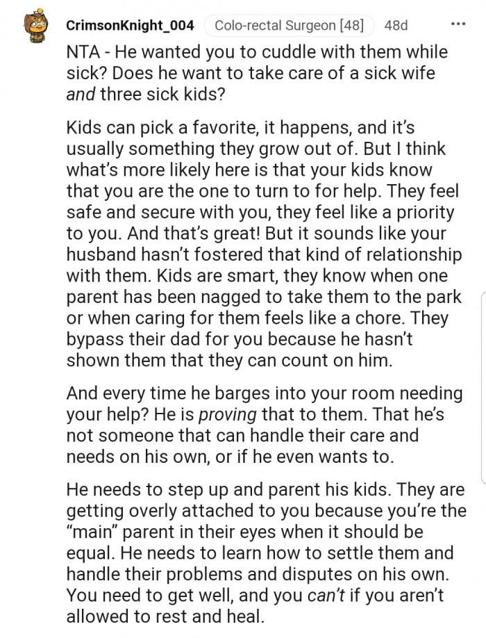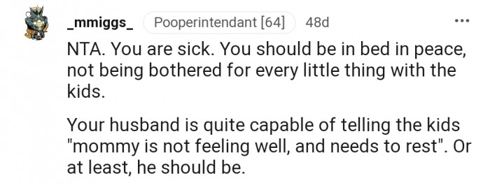 Reddit.comOP got ill and asked her husband to help out with caring for the kids. However, the kids depend on her a lot, without even considering if their dad is around
