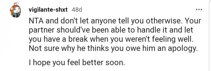 "Your partner should've been able to handle it and let you have a break when you weren't feeling well."