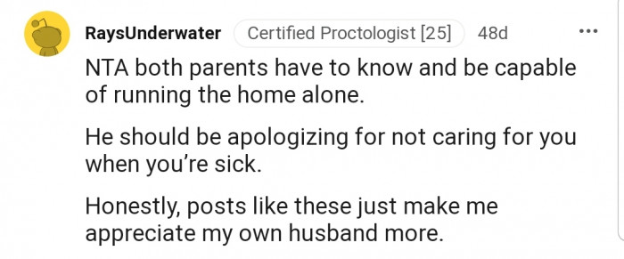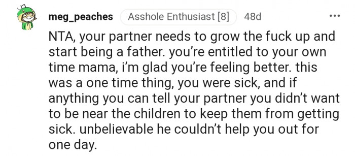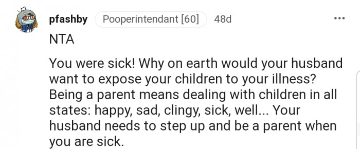 "Your husband needs to step up and be a parent when you are sick."