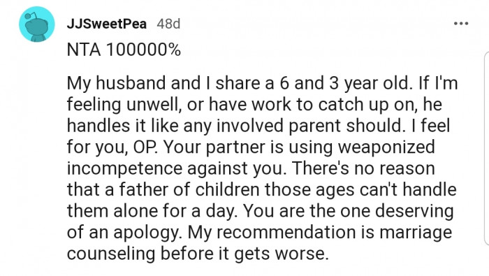 "My husband and I share a six and three-year-old. If I'm feeling unwell or have work to catch up on, he handles it like any involved parent should."