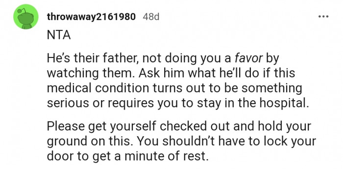 "He’s their father, not doing you a favor by watching them."