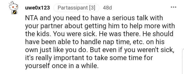 Unfortunately, OP's husband found it difficult to handle the kids, and they kept disturbing her rest at intervals. This caused OP to snap at everyone.