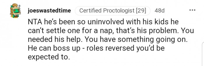 Reddit.comOP explained that she does most of the childcare and housework at home, with her husband doing little or nothing to reduce the pressure from their three kids