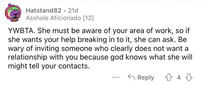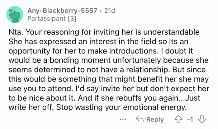 She explained that she had an upcoming work event that she was considering inviting the daughter to attend with her. The OP explained that the daughter had previously expressed interest in her career field, so she thought it might be a good opportunity for them to break the ice and for the daughter to network.