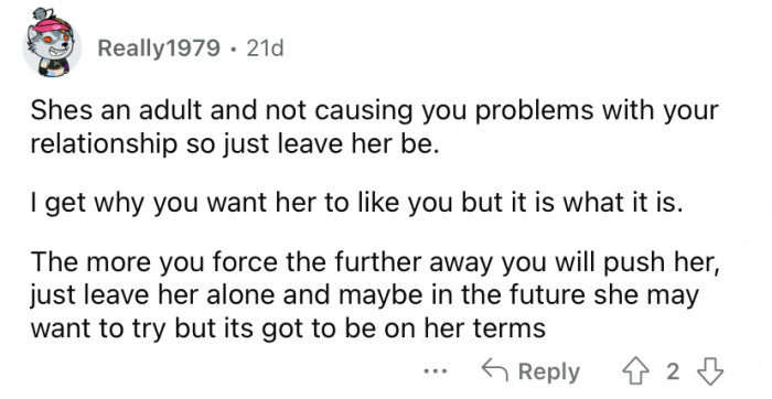 The OP explained that her partner has two children: a 19-year-old son and a daughter in her early twenties. The woman says she has a great relationship with the son, but when it comes to the daughter, her attempts to form a bond have been continuously rejected.