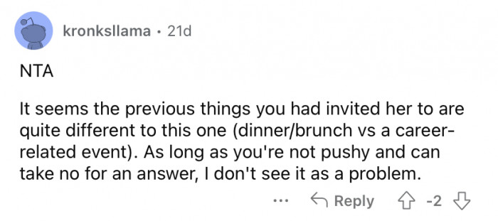 Reddit/AdFew2245She explained that she had an upcoming work event that she was considering inviting the daughter to attend with her.