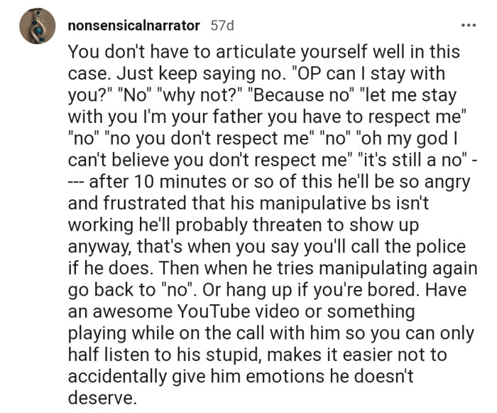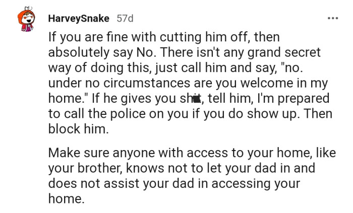 One day, while OP was on vacation overseas, her brother (who lives in her home) informed her that their father had called to ask if he could move in with them for a week. OP wasn't comfortable with this request because her father was known for taking advantage of people.