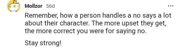 The commenters were sympathetic toward OP's situation; however, they advised her to remain firm and not waver in her decision.