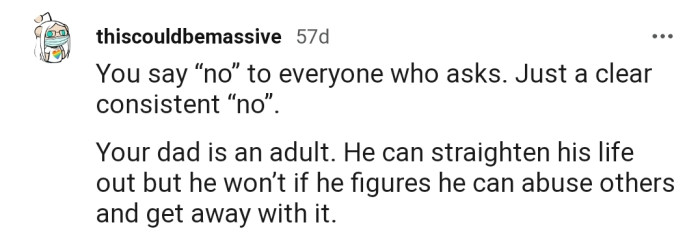 Although OP refused her father’s request, she imagines he will keep pressuring her until he gets his way. This is why she decided to seek advice from the Reddit community on how best to handle the situation.