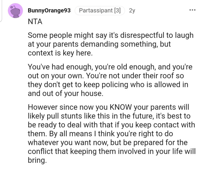 "You're not under their roof, so they don't get to keep policing who is allowed in and out of your house."