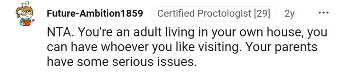 The commenters believe OP is NTA. Many shared their views about OP’s parents’ behavior, accusing them of being controlling.