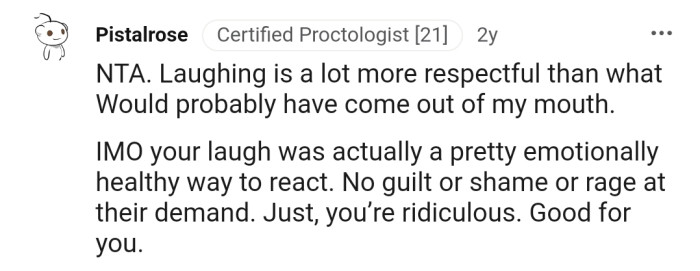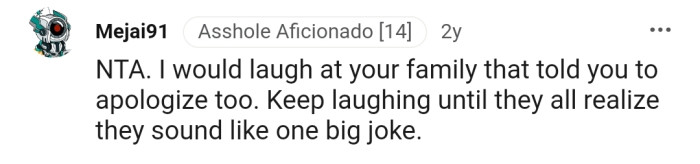 In response, OP laughed and asked if her mother was out of her mind. Thereafter, OP’s family requested that she apologize, leading her to ask the AITA question.