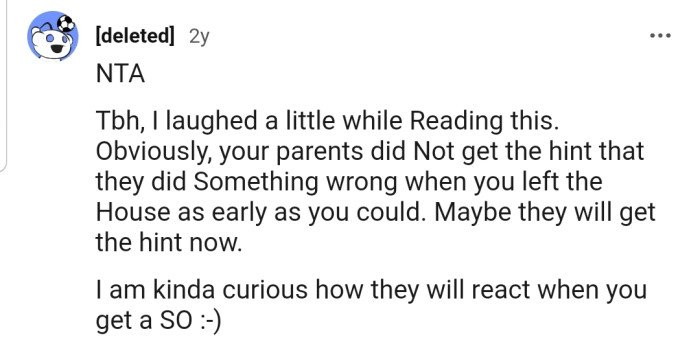 "Obviously, your parents did not get the hint that they did something wrong when you left the house as early as you could."